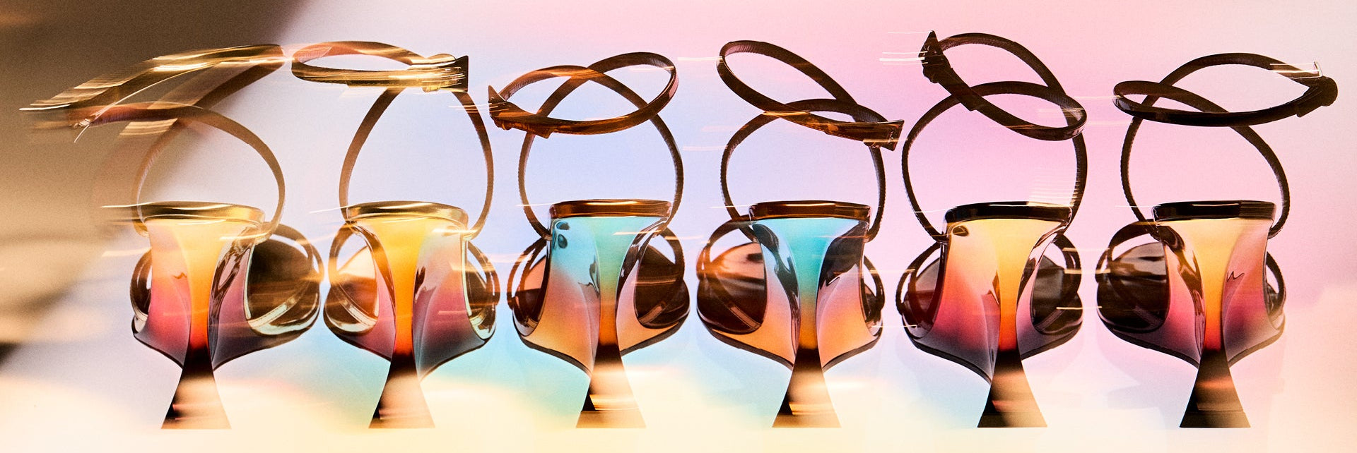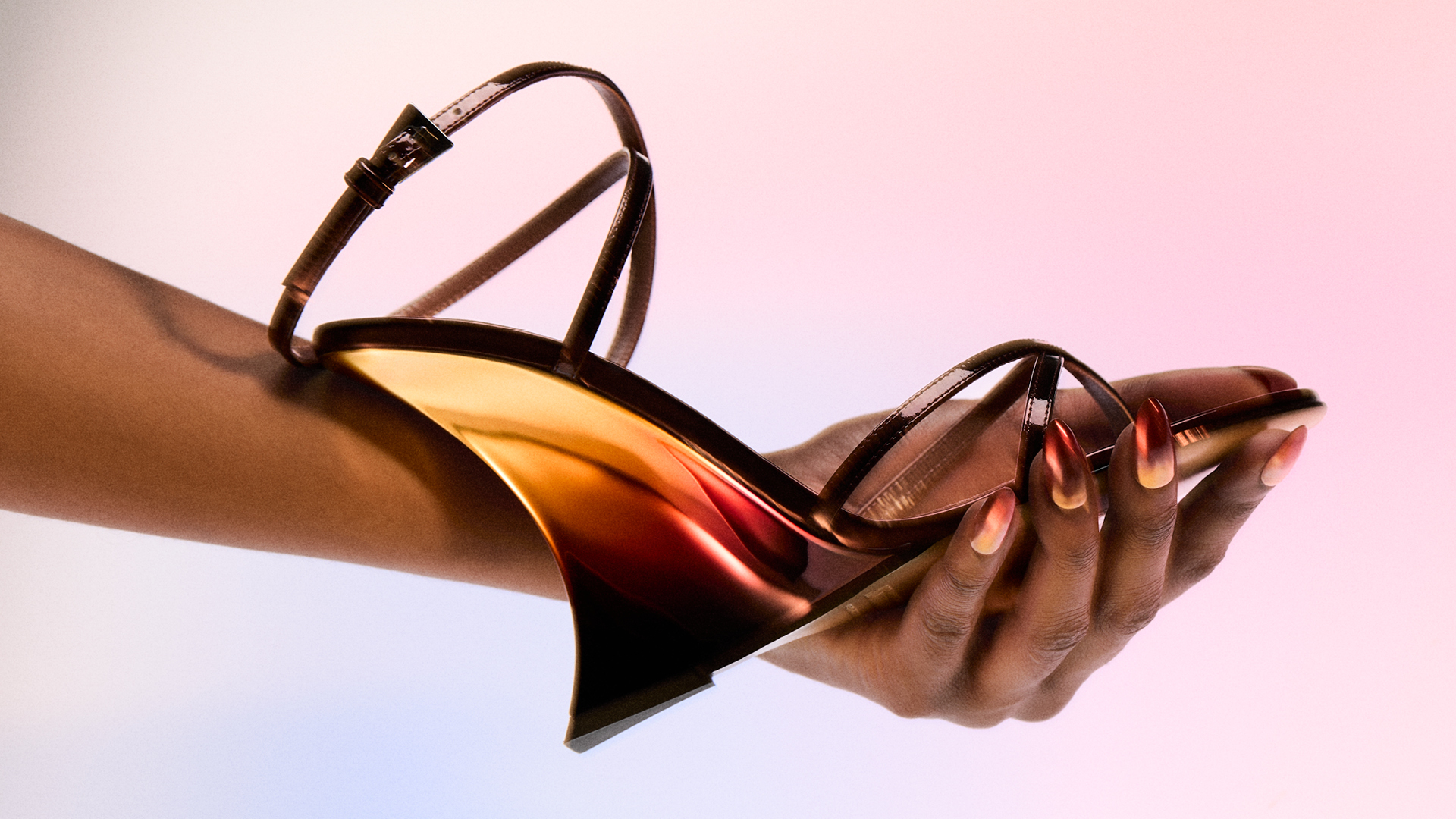 Nina Sunset evokes the feeling of an endless summer bathed in vibrant desert tones and twilight hues, an homage to freedom, femininity, and the contrasts that define the Paris Texas universe. With its gravity-defying wedge design decked in a gradient of sunset colors, it's en emblem of bold minimalism.
